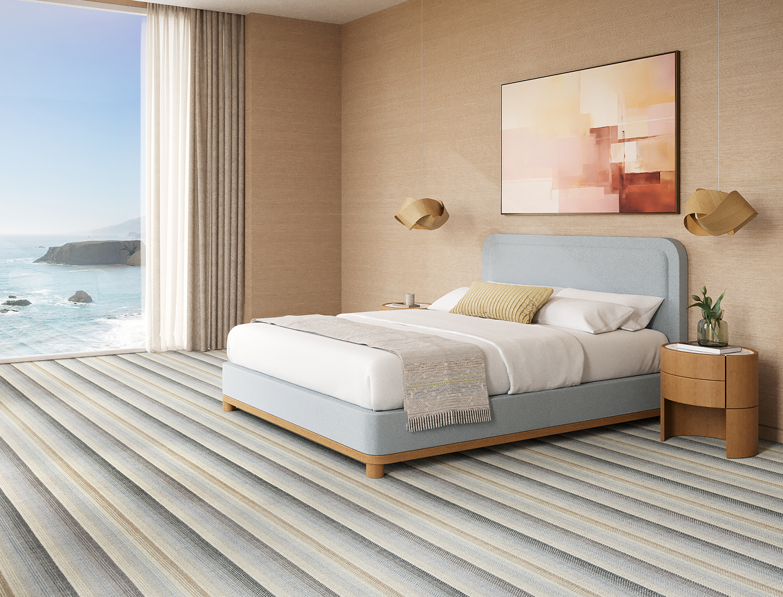 In this layout, both the bed and nightstands rest entirely on the rug. Be sure to include the legs of the nightstands to keep them steady and avoid any wobbling. -